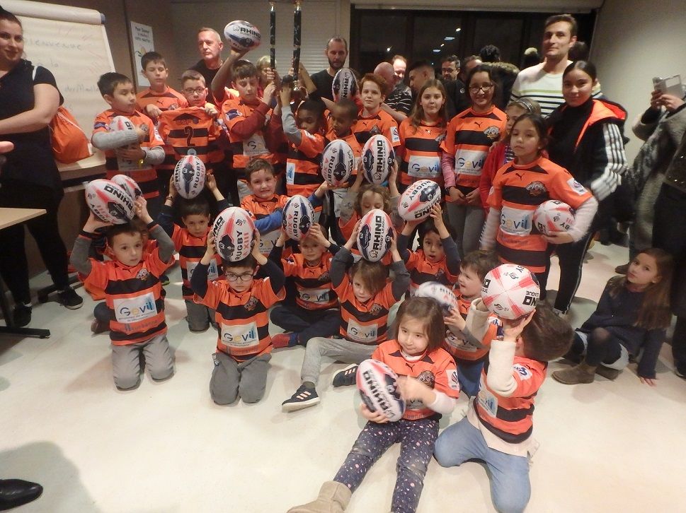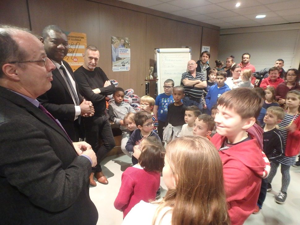 Tous les éducateurs et dirigeants ont applaudi cette initiative Présidentielle de donner des outils et un ballon à chaque enfant, car c'est le meilleur moyen de faire connaître la discipline et de donner du plaisir à tous ces enfants ! Ensuite, à l'appel de leur nom, chaque jeune des catégories Premiers pas à Benjamins s'est vu remettre un ballon, des protèges-dents et un livret d 'accueil pour les nouveaux licenciés. Tous les enfants et parents se sont ensuite retrouvés pour déguster un couscous, préparé par la maman de Ayoub et partager la galette. Il y eut beaucoup de reines et de rois !